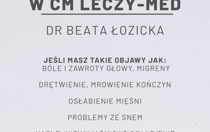 Neurolog w CM Leczy-Med! Z radością informujemy, że do zespołu CM Leczy-Med dołączył nowy specjalista neurolog - dr Beata Łozicka, która przyjmuje pacjentów w ramach [...]